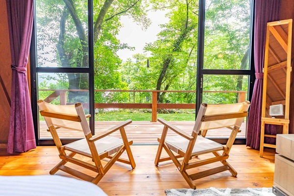 施設全体は森に囲まれ、周囲に高い建物も少ないため、日常の喧騒を忘れてゆったりと過ごせる環境。チェックインした瞬間から、空気の違いを感じられるような落ち着いた雰囲気が広がります。