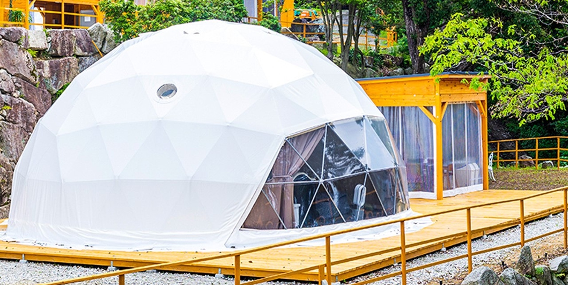 施設は名古屋市から車で約60分、公共交通機関利用でも中津川駅から無料送迎があるためアクセスも良好。敷地内には頑丈な造りのドーム型テントが5棟あり、室内は冷暖房完備で約30~50平方メートルと広々としており、2~5名の宿泊に対応。個別トイレ・シャワールーム付きで快適な滞在が約束されます。室内には安心のアメニティが揃っていて、さらにフロントではクレンジングや化粧水など女性向けアイテムも自由に利用できます。