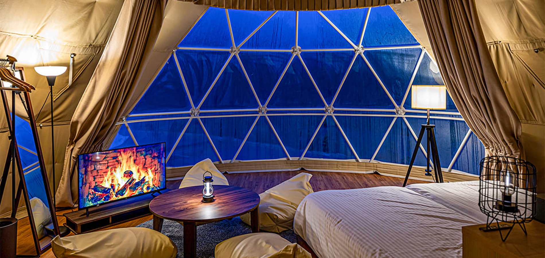 | デラックスドーム | 2棟 | スマートTVを配置したプライベートシアターが楽める大型ドーム型テント | 33 m² | 最大4名 | シングルベッド×2+お布団 | 19,800円/名~ |