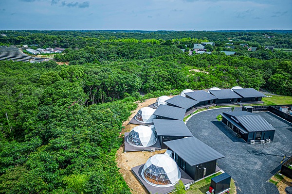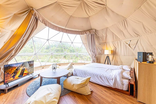 まず心をつかまれるのは、全7棟だけの小規模グランピングという点。大きなリゾート施設のような喧騒とは無縁で、落ち着いて過ごせるのが特徴です。ドーム型テントはふくらみのある丸いフォルムで、中に入ると驚くほど開放感があります。直径6m、33㎡という広さは、一般的なホテルのツインルームよりも体感的に広く、家族や友人とゆったり過ごせる空間です。全室が冷暖房完備・Wi-Fiあり・専用シャワー&トイレ付きという仕様なので、キャンプというよりは「自然の中にあるホテル」という感覚に近いでしょう。