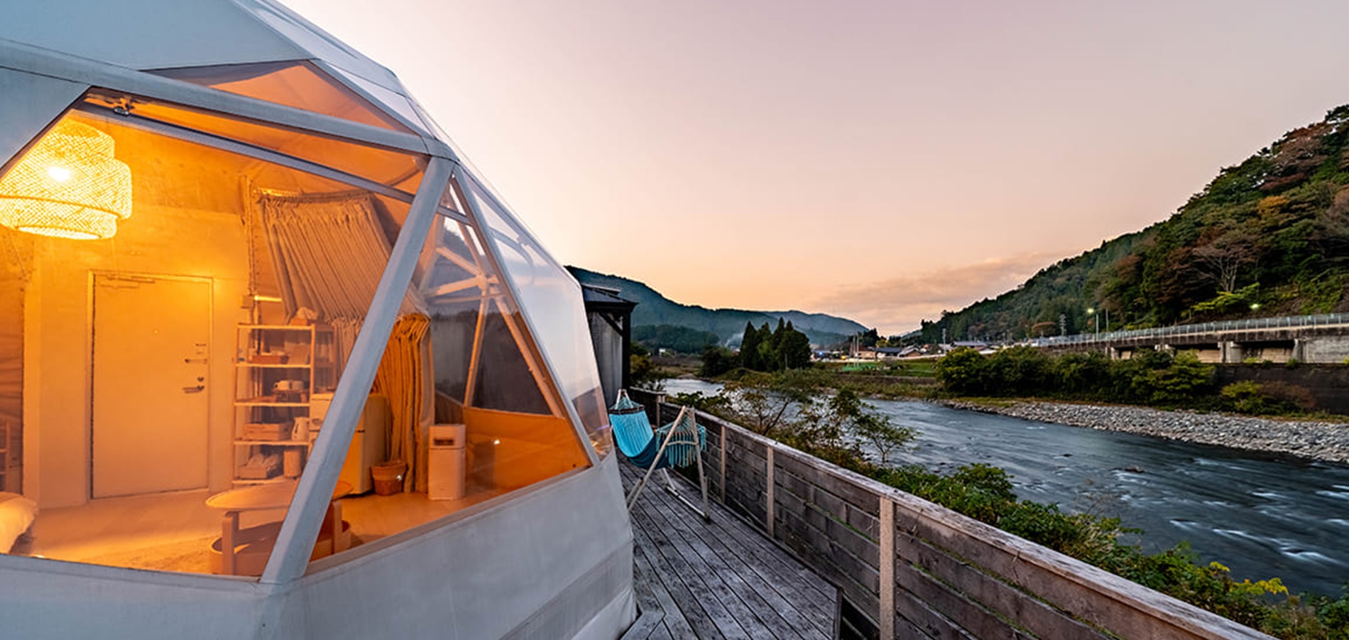 川の流れを間近に感じながら滞在できるグランピング施設は、全国的に見ても希少。朝は川霧がゆっくりと立ちのぼる幻想的な景色、昼は太陽が反射してきらめく水面、夜には星明かりと川音だけが包む静寂ーーそんな「自然と調和した時間」を丸ごと味わえる点が大きな魅力です。