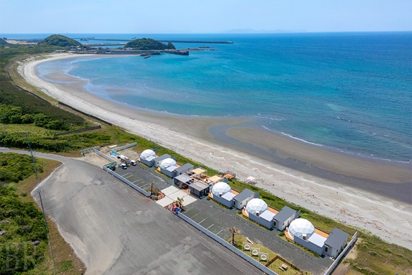 ナミオトテラスリゾート鹿児島の宿泊棟は、全棟がオーシャンフロント。ドーム型テントが海に向かって配置されており、テントの外に出るとすぐ目の前に海が広がります。