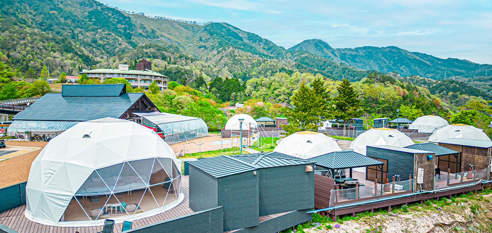 宿泊は5タイプ。眺望抜群の「ダムビュードーム」「レイクビュードーム」、広々とした「プレミアムドーム」、そして別荘風の「ケビンコテージ」「プレミアムコテージ」。どのタイプも冷暖房完備・バスルーム付きで、アウトドア初心者でもホテル感覚で泊まれるのが特徴です。