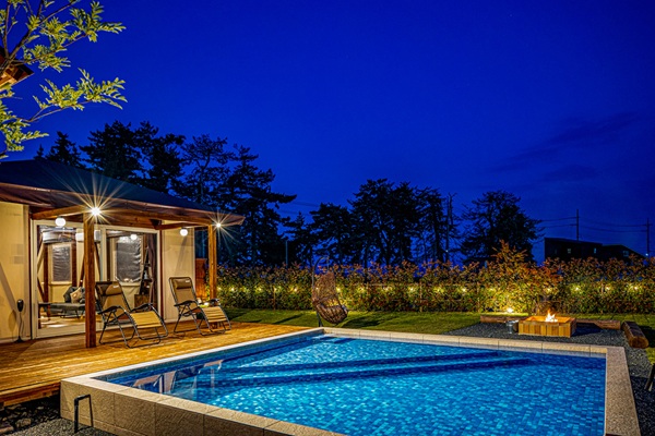 この施設の最大の魅力は、全10棟という限られた空間に、異なる3タイプのグランピングテントを配置している点です。まるでリゾートホテルのようなサファリテント、二つのドームを繋げたコネクトドーム、そして広々としたスタンダードドーム。それぞれがプライベート感を重視した造りで、滞在するゲストのスタイルに合わせた過ごし方を叶えてくれます。特に、関西初となる「プライベートプール付きサファリテント」は人気の一棟。誰にも邪魔されない空間で水遊びや日光浴を楽しむ時間は、まさに大人の隠れ家そのものです。