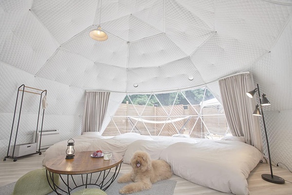 宿泊棟はすべてドーム型テント。外観はアウトドア感がありながら、室内は冷暖房完備で、季節を問わず快適に過ごせる設計になっています。