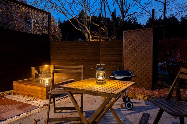 • テラスで露天風呂の湯音を聴きながら食べるBBQは最高